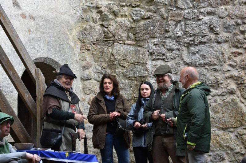 Im Innenhof bekamen wir dann eine ausführliche Information vom Kastellan in historischem Gewand über die Tätlichkeiten der Raubritter, die immer wieder Bierpanscher, Wirte oder Wirtinnen “inhaftierten”, um eine Ablösung zu erpressen. Dies wurde in einer kurzen Komödie mit Helga, Kathy, Reinhold und Dieter, nach einer kurzen Einstudierung der Rollen vorgetragen.