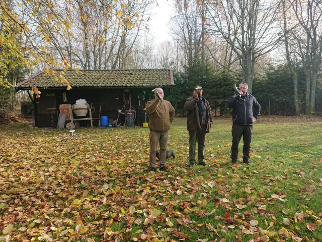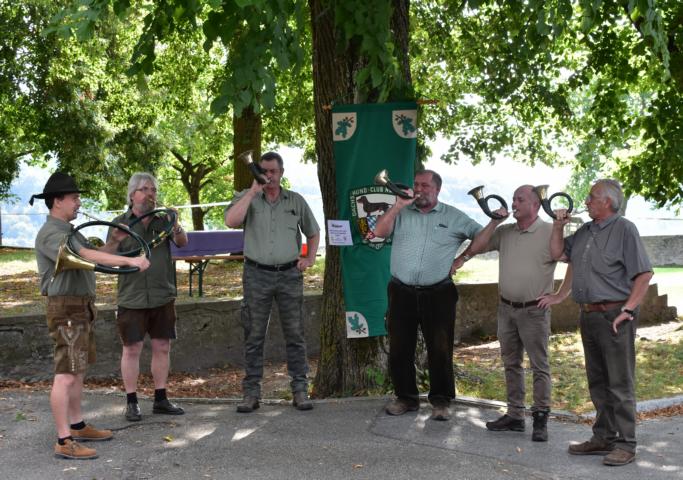 Unsere Jagdhornbläser Roland, Markus und Michael nahmen ihre Musikinstrumente in die Hand und spielten ein paar Stücke, sehr zur Freude der anwesenden Dackel, die natürlich sofort mitsangen.