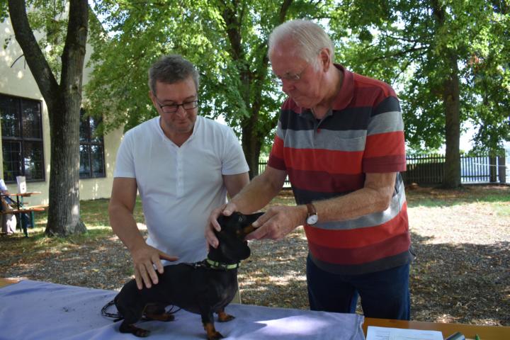Schnell hatte auch unser Zuchtrichter, Herr Peter Hoferer, seinen “Untersuchungstisch”, an dem er mit Reinhold Galli die Hunde in Augenschein nahm, um nach positiven und negativen Merkmalen des jeweilig gemeldeten Dackels zu schauen.