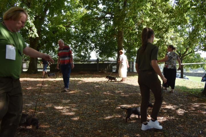 Dann mußte jeder Hundeführer mit seinem Dackel mehrere Runden auf dem Parcour drehen, während Herr Hoferer über Mikrofon seine Beobachtungen über Lauf, Größe, Haltung und andere auffällige und unauffällige Merkmale dem aufmerksam zuhörenden Publikum preisgab.